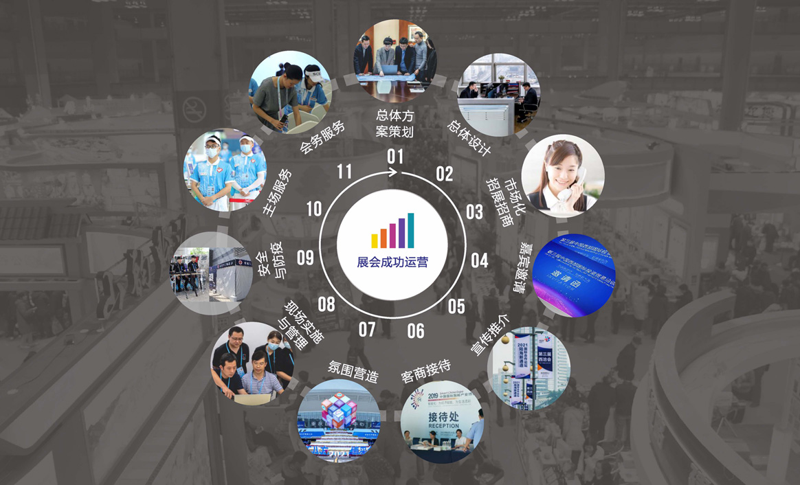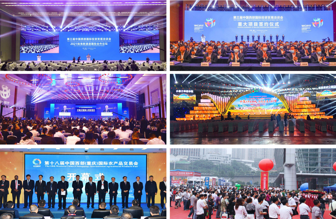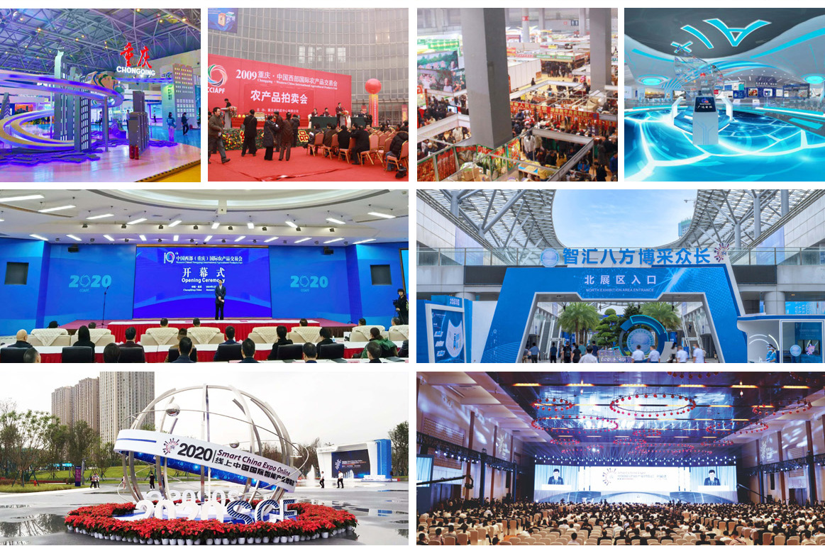 总体方案策划、总体设计、市场化招展招商、嘉宾邀请、宣传推介、氛围营造、现场实施与管理、主场服务、会务服务、客商接待、安全与防疫等管理全过程。主办和承办的大型展会包括中国西部国际投资贸易洽谈会(西洽会)、中国国际智能产业博览会(智博会)、中国西部(重庆)国际农产品交易会(西部农交会)、中国(重庆)全球采购会、国际服务贸易(重庆)高峰会、中国(重庆)国际创新物流与交通运输博览会、中国(重庆)汽车摩托车暨配套产业博览会、中国(重庆)装备工业博览会等120余场展会活动。其中西洽会(前身渝洽会)经过我公司多年专业打造,从最初展览规模不到2000平方米,发展到现在的110000平方米。西部农交会经过我公司多年持续培育,展览规模由最初500余平方米,发展到现在的50000余平方米。这两大展会均被评为“全国十大政府主导品牌展会”